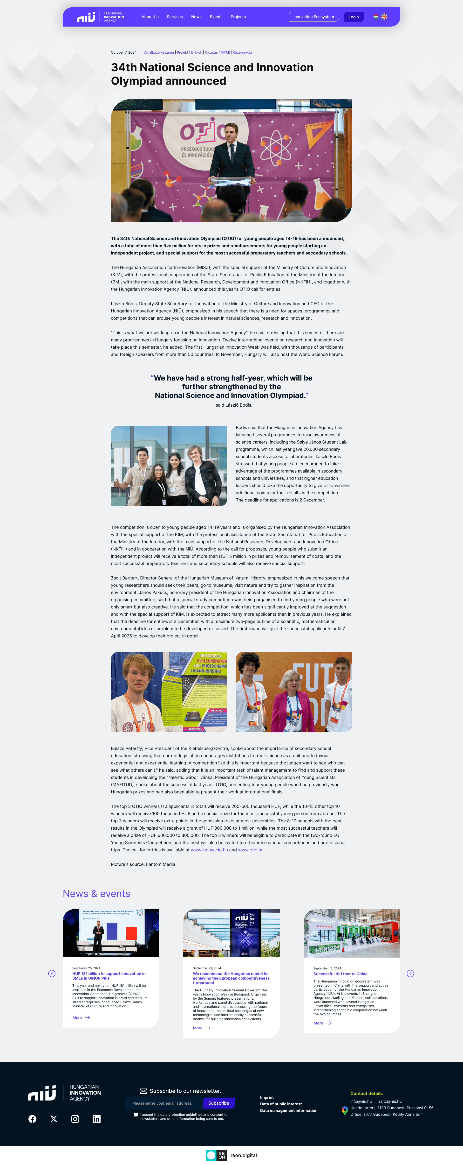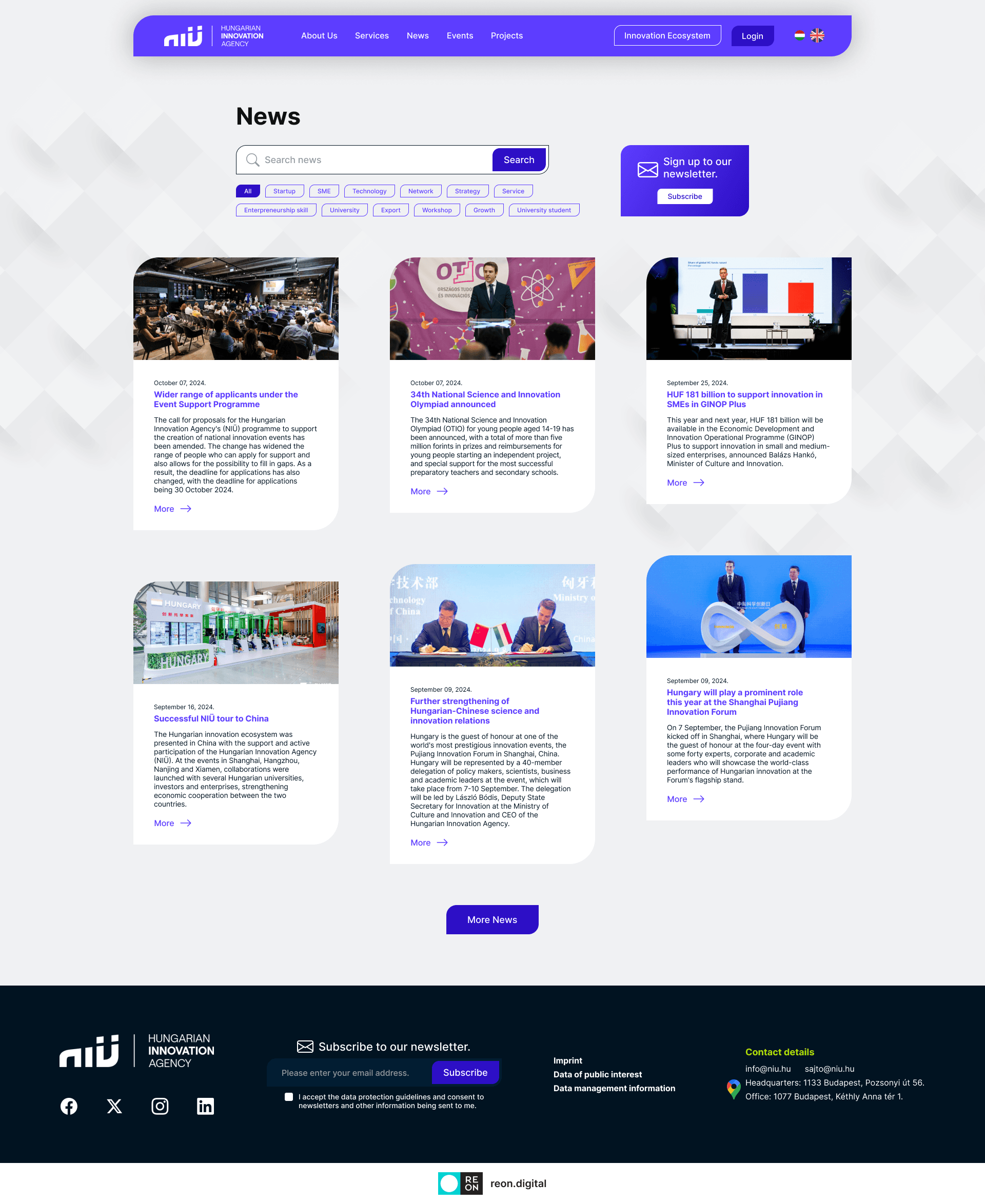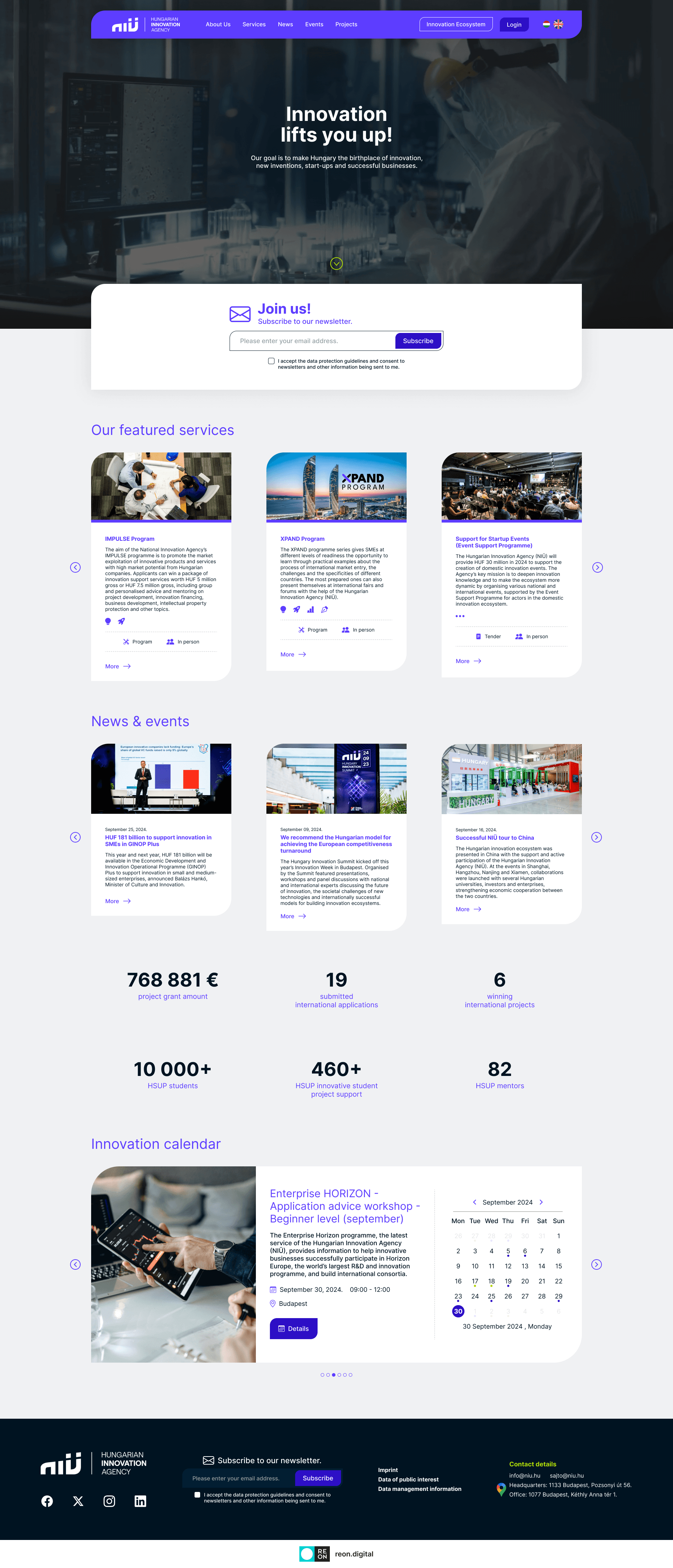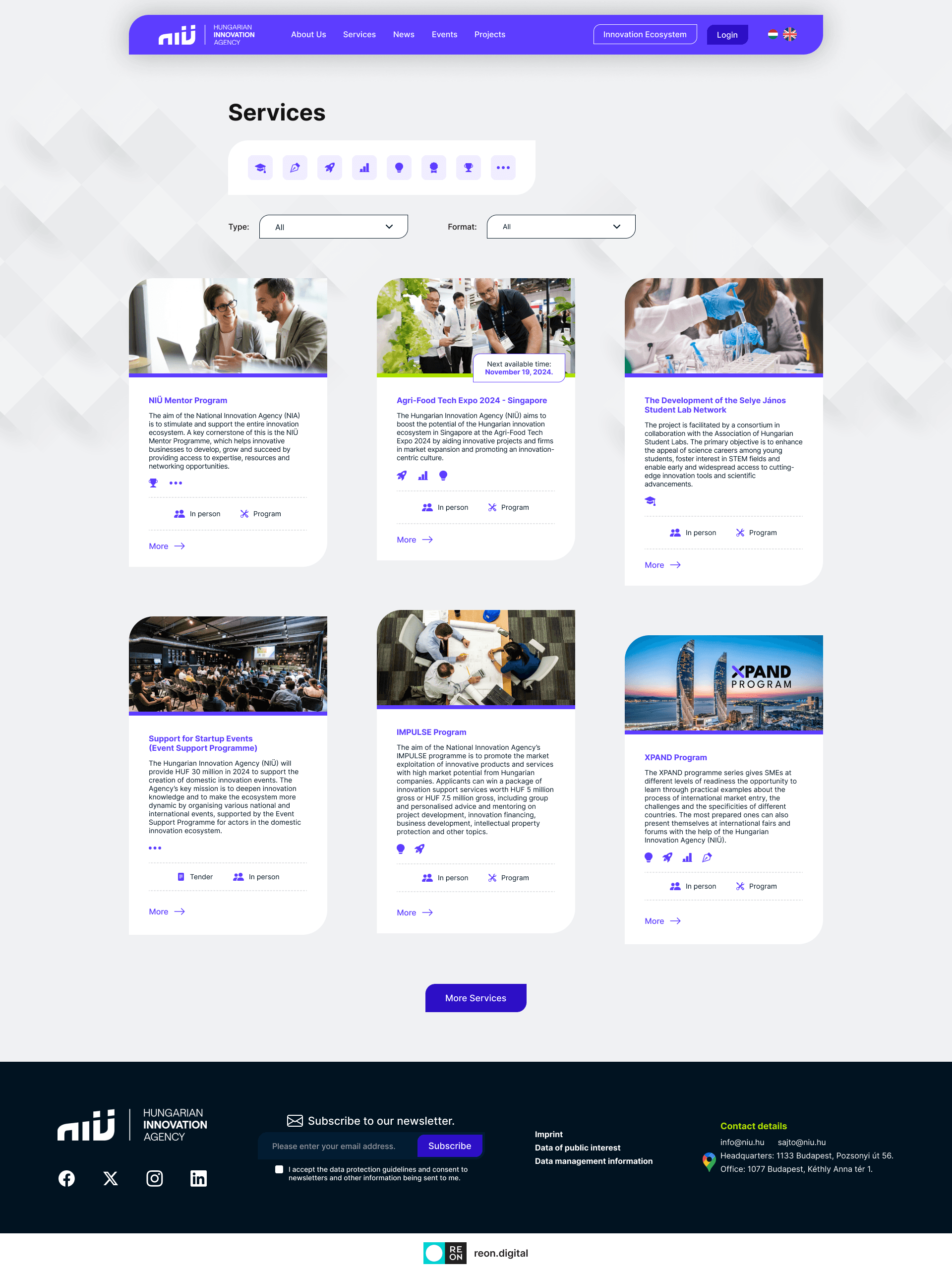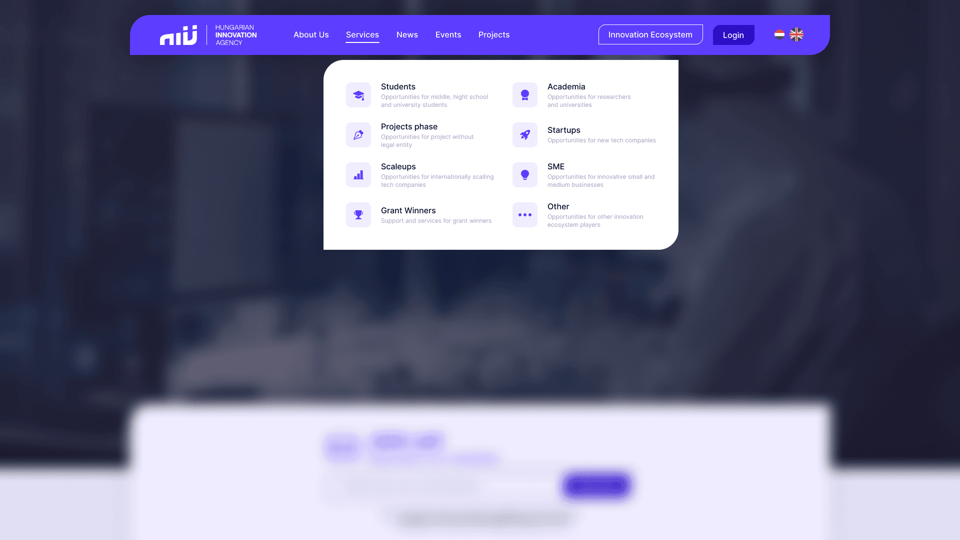 The aim of the project was to design a forward-thinking digital platform for the Hungarian Innovation Agency that adapts to the evolving needs of the innovation ecosystem. The website serves as a dynamic hub to connect key ecosystem players, foster collaboration, and promote a culture of innovation through accessible, user-focused design and clear content structure.